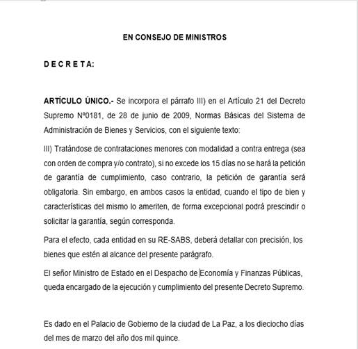 Implementación del párrafo III al artículo 21, del decreto supremo 0181, cuyo objetivo es mejorar la funcionabilidad de las garantías en los contratos a contra entrega en con contrataciones menores, para lo cual se plantea mecanismos de petición de garantías que posibilitarán solucionar los vacíos jurídicos que deja el presente decreto supremo identificadas en el diagnóstico.